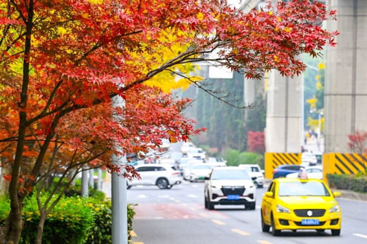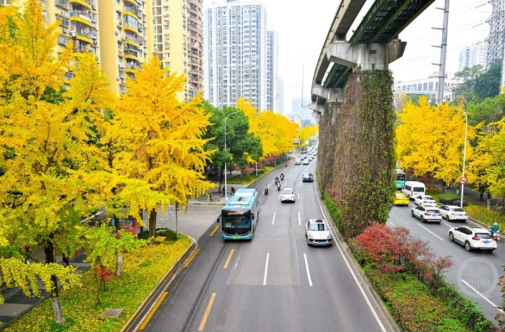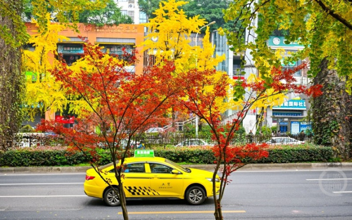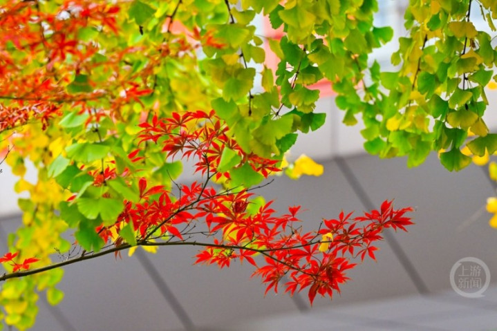 近日,在重庆市南岸区学府大道,各种树木和植物呈现出红、黄、绿等色彩交织的景观,成为冬日城市里一道温暖而浪漫的风景线,更为城市增添了几分诗意,吸引不少市民和摄影爱好者争相驻足欣赏。